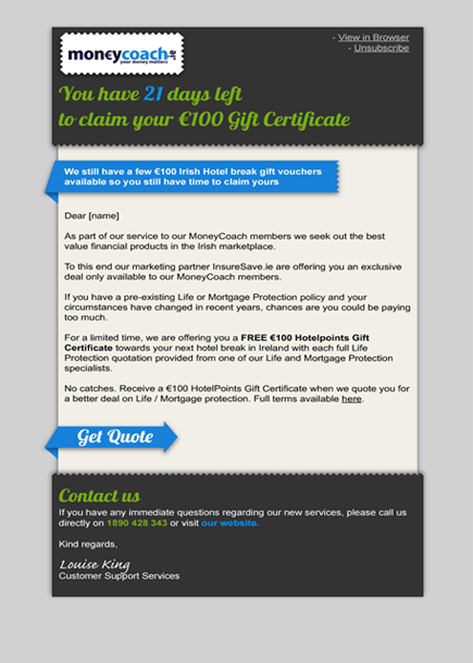 - 2nd email - 1 week later with exclusive offer for insurance products.