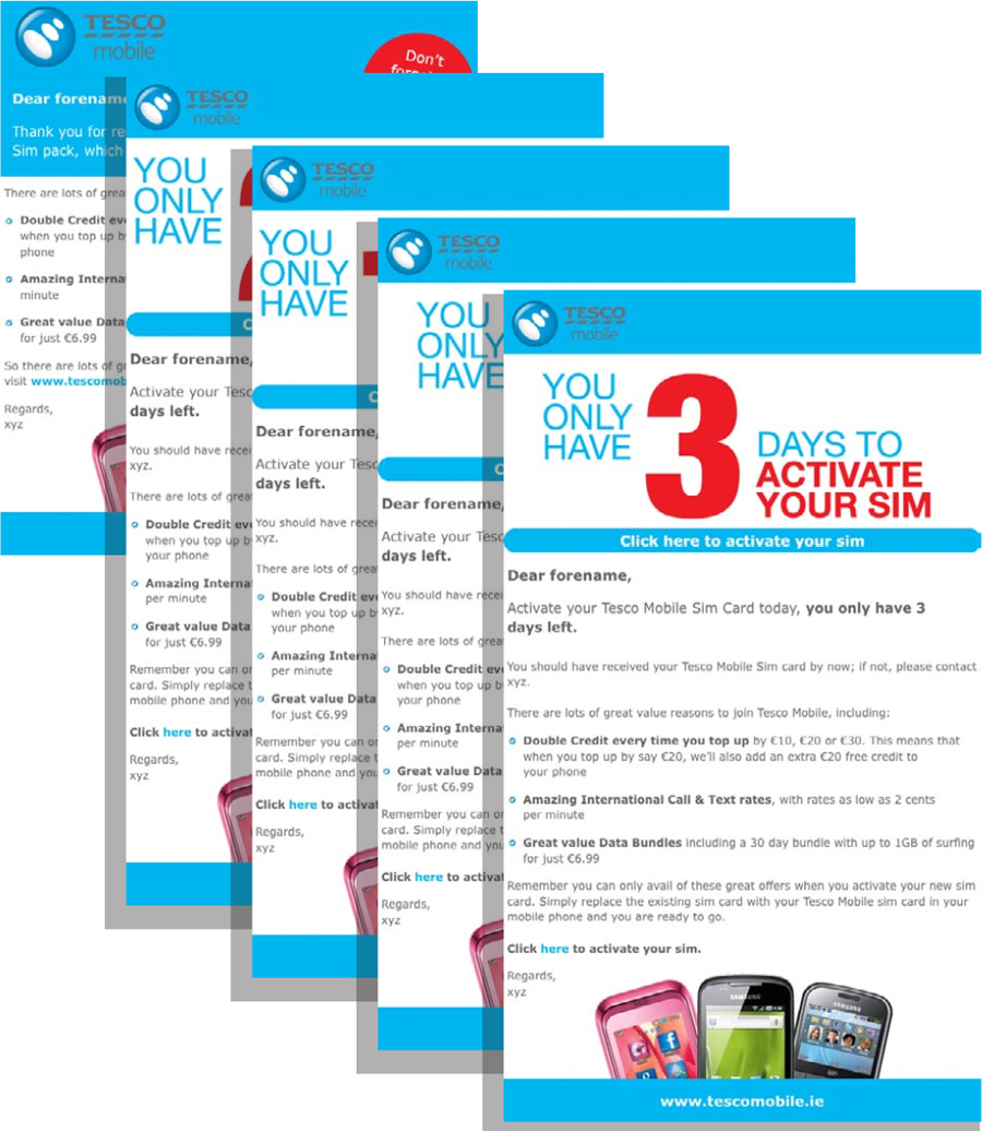 The CRM process was designed to encourage activation of sim card with 4-5 emails over the initial 30 day period: